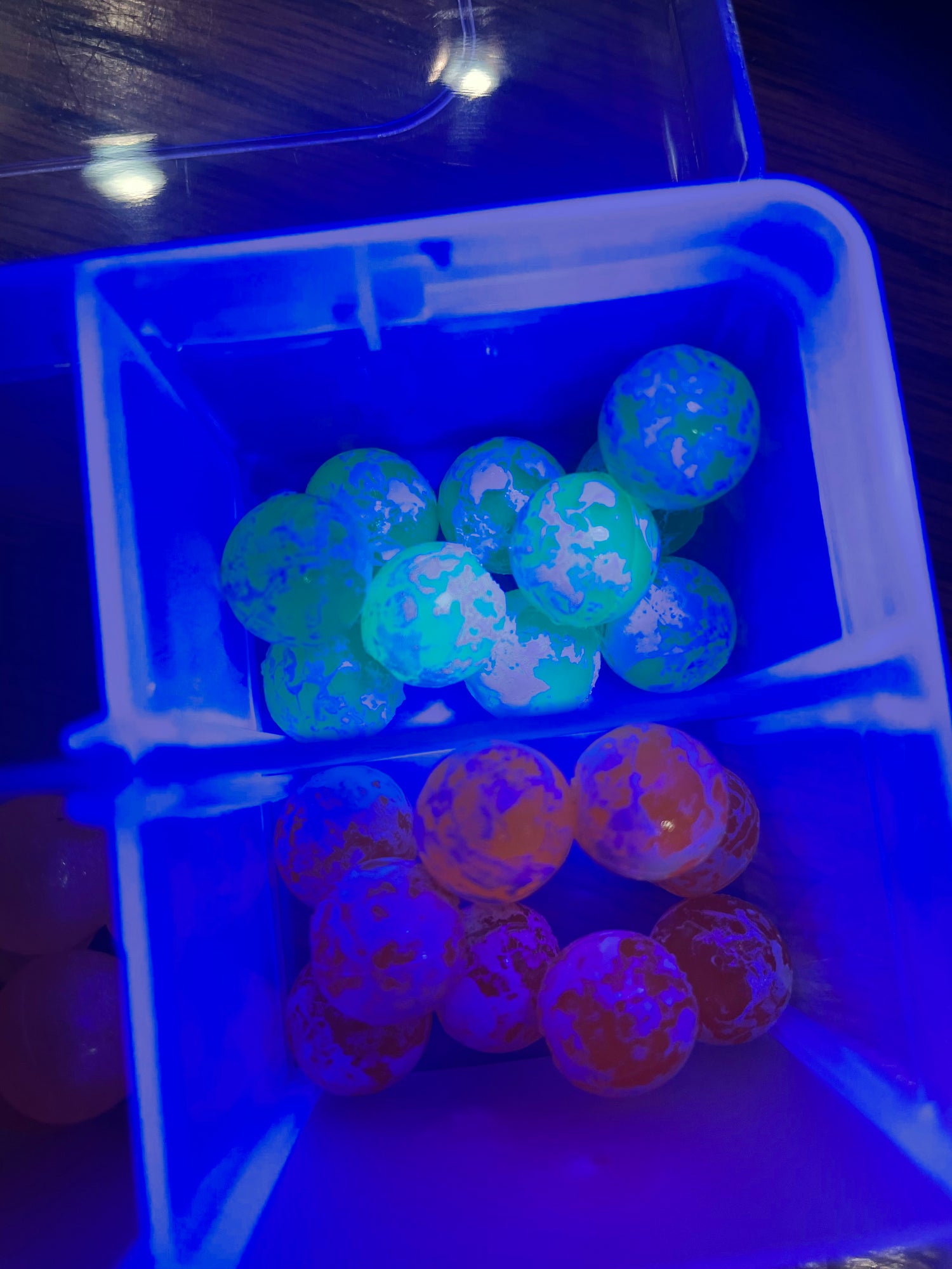 Our soft beads are enhanced with UV dyes to help attract more fish. Sometimes fish can be finnicky and it helps to have UV beads in your arsenal. The amount of UV in each color does vary, but our chartreuse and orange colors are the brightest in terms of UV.